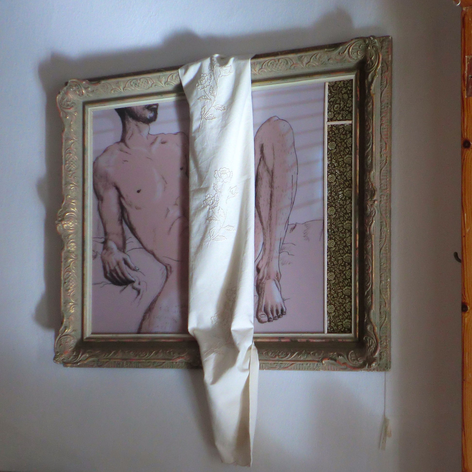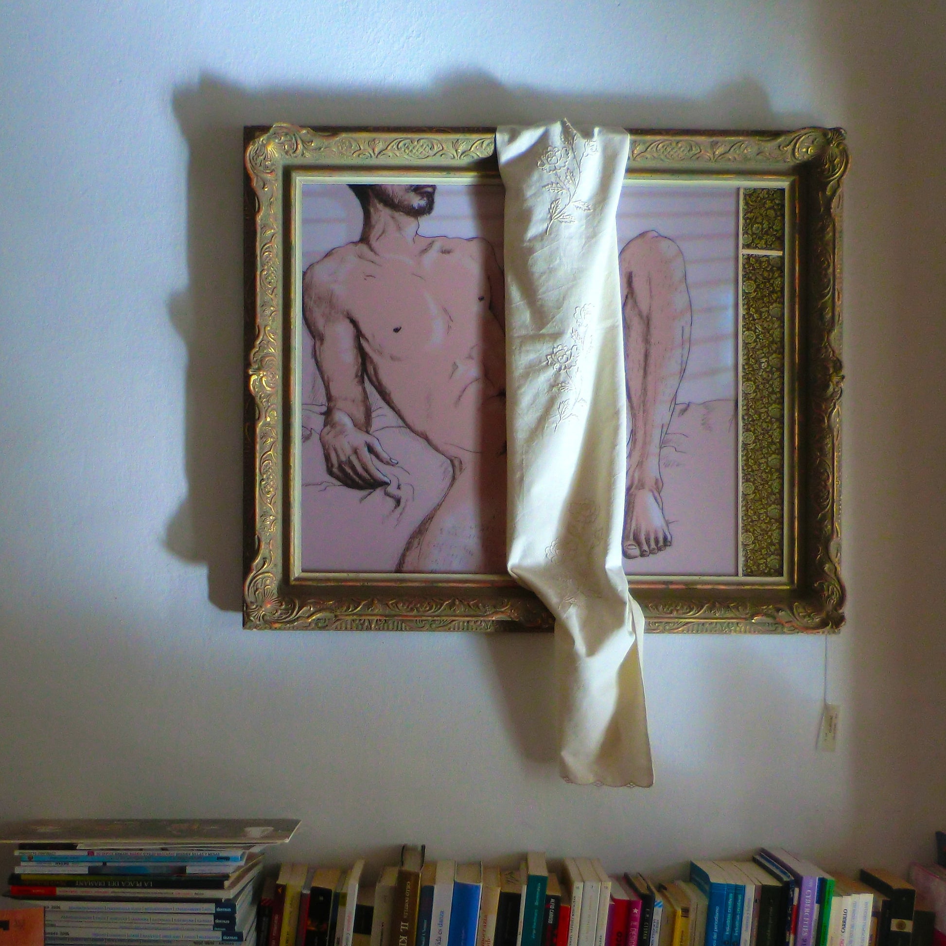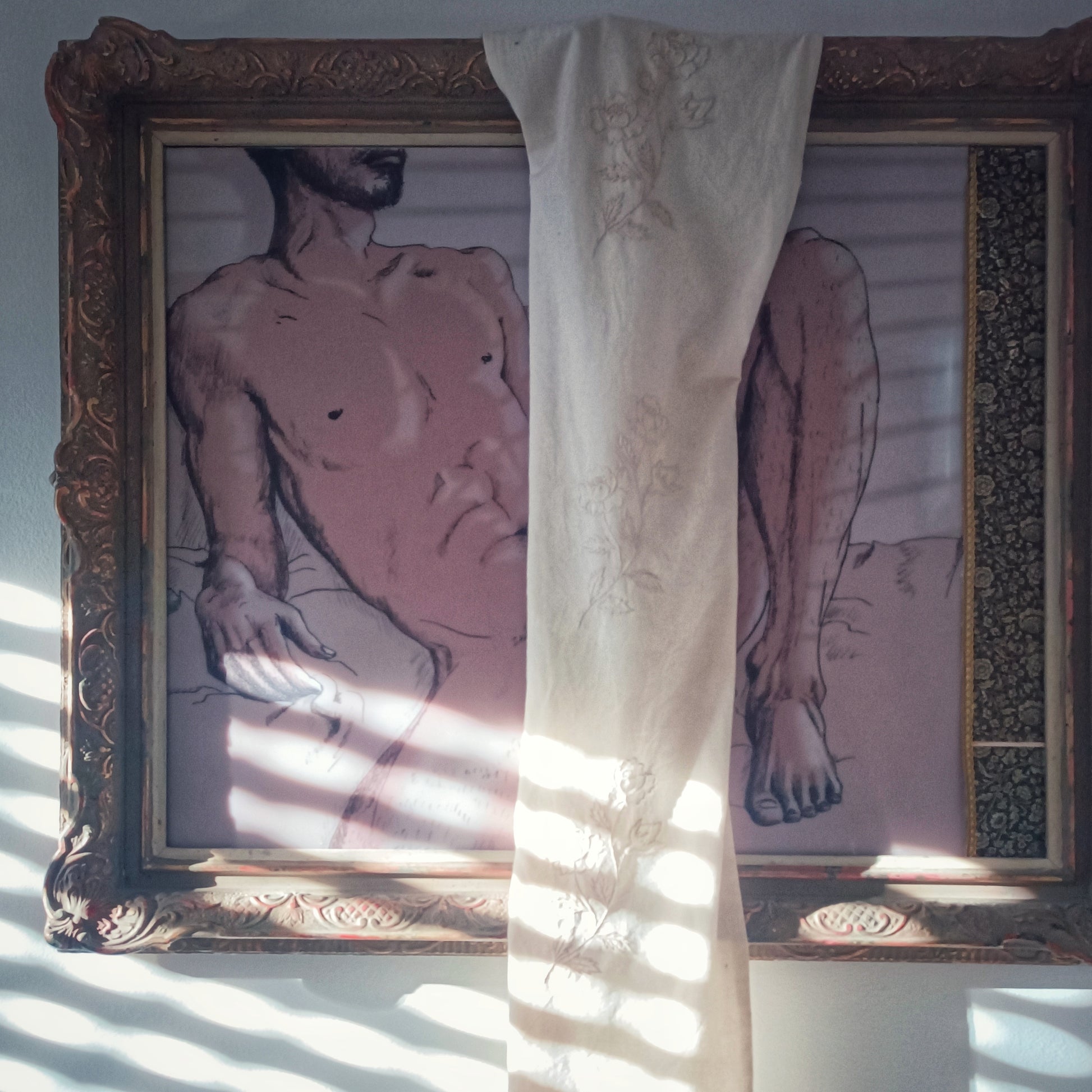 Freehand drawing, pencil and digital colors, print on pmma, textile in pmma, textile with handmade embroidery, wood and painted plaster frame.