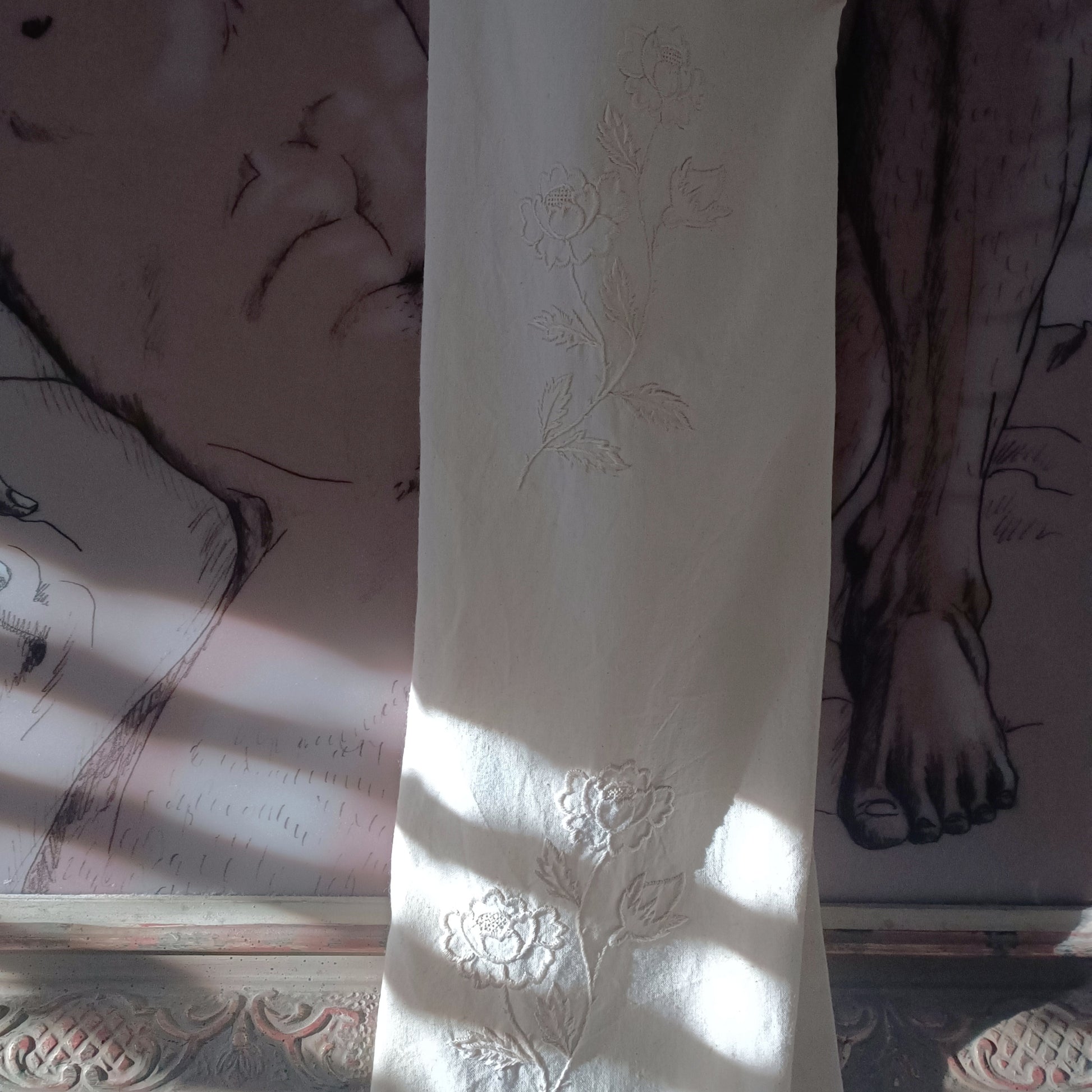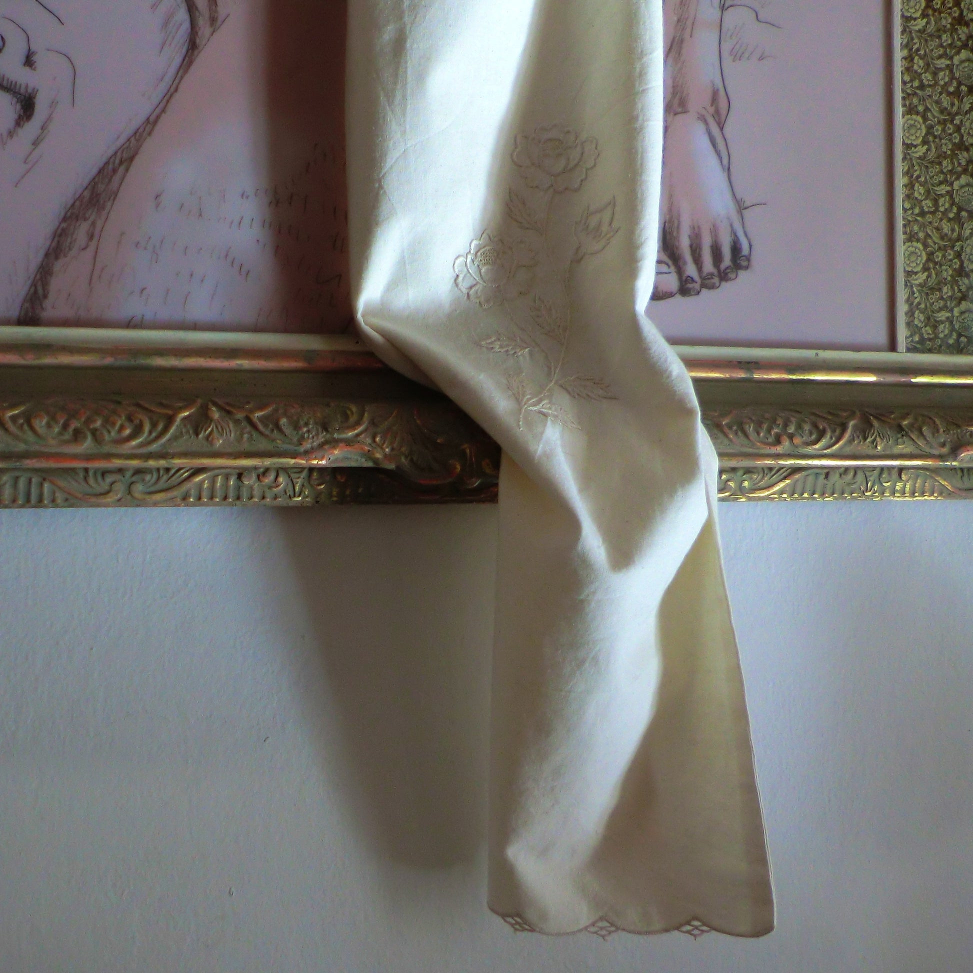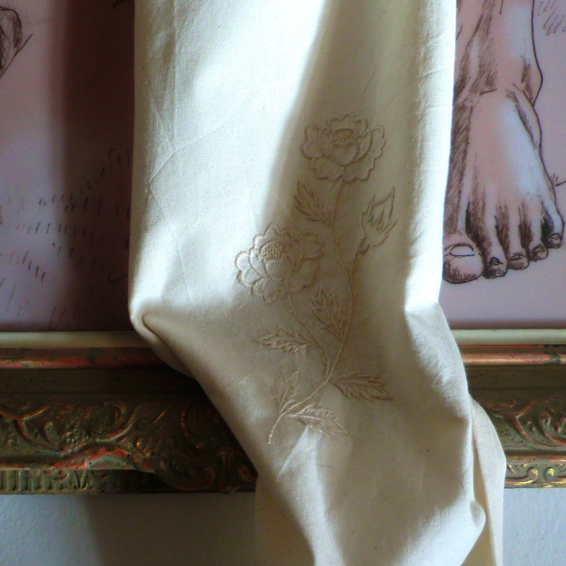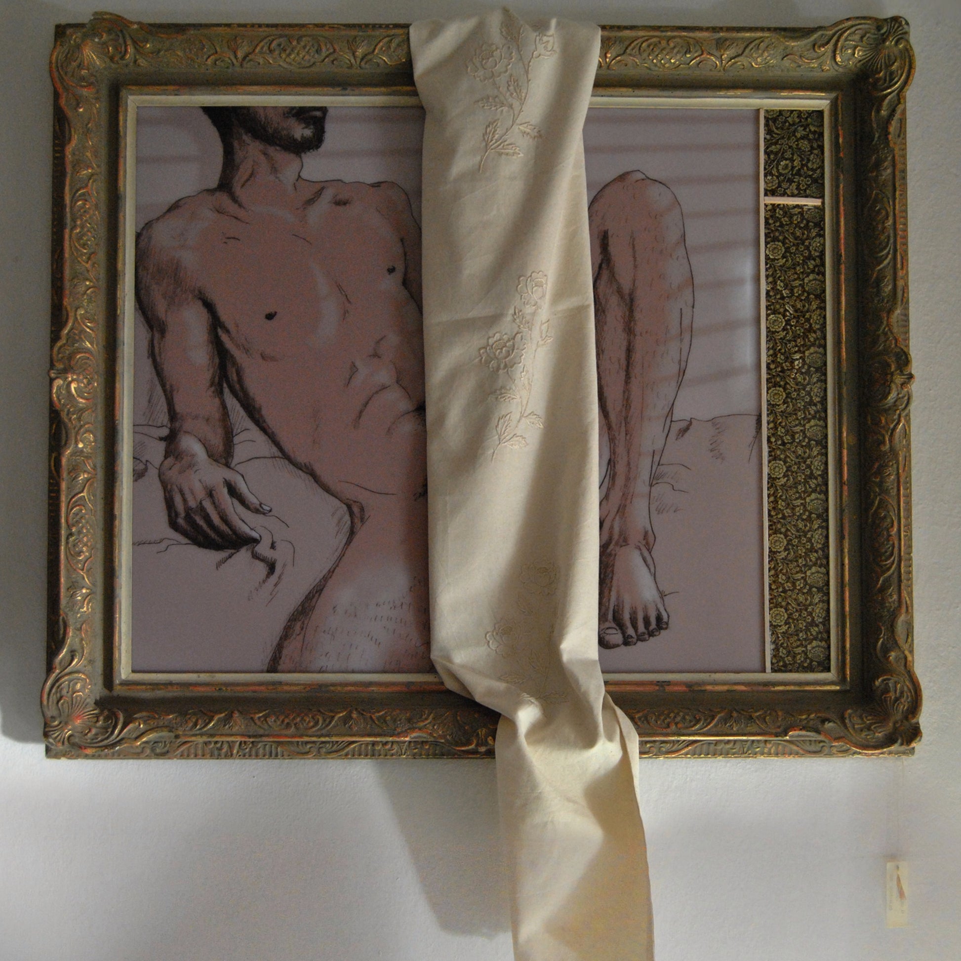 Freehand drawing, pencil and digital colors, print on pmma, textile in pmma, textile with handmade embroidery, wood and painted plaster frame.